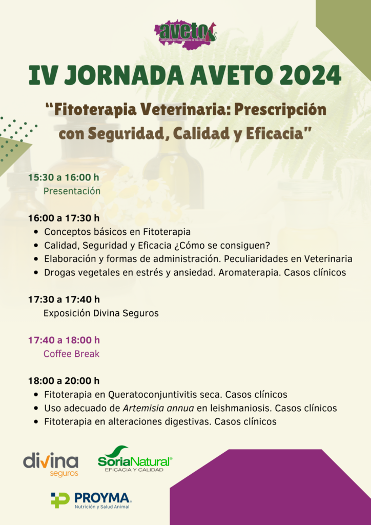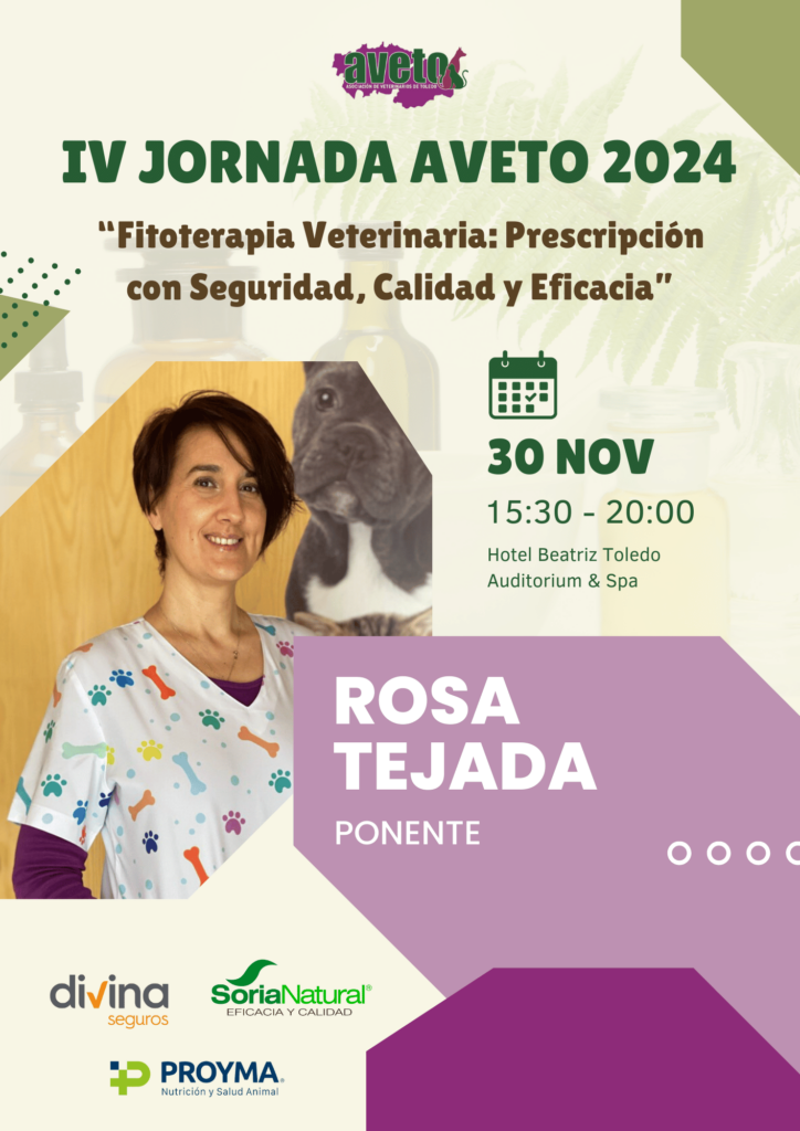 El próximo 30 de noviembre, en el Hotel Beatriz Toledo Auditorium & Spa, celebraremos la IV Jornada AVETO, centrada en un tema de gran relevancia para la práctica veterinaria: «Fitoterapia Veterinaria: Prescripción con Seguridad, Calidad y Eficacia» impartida por Rosa Tejada. La jornada se desarrollará de 15:30 h a 20:00 h.